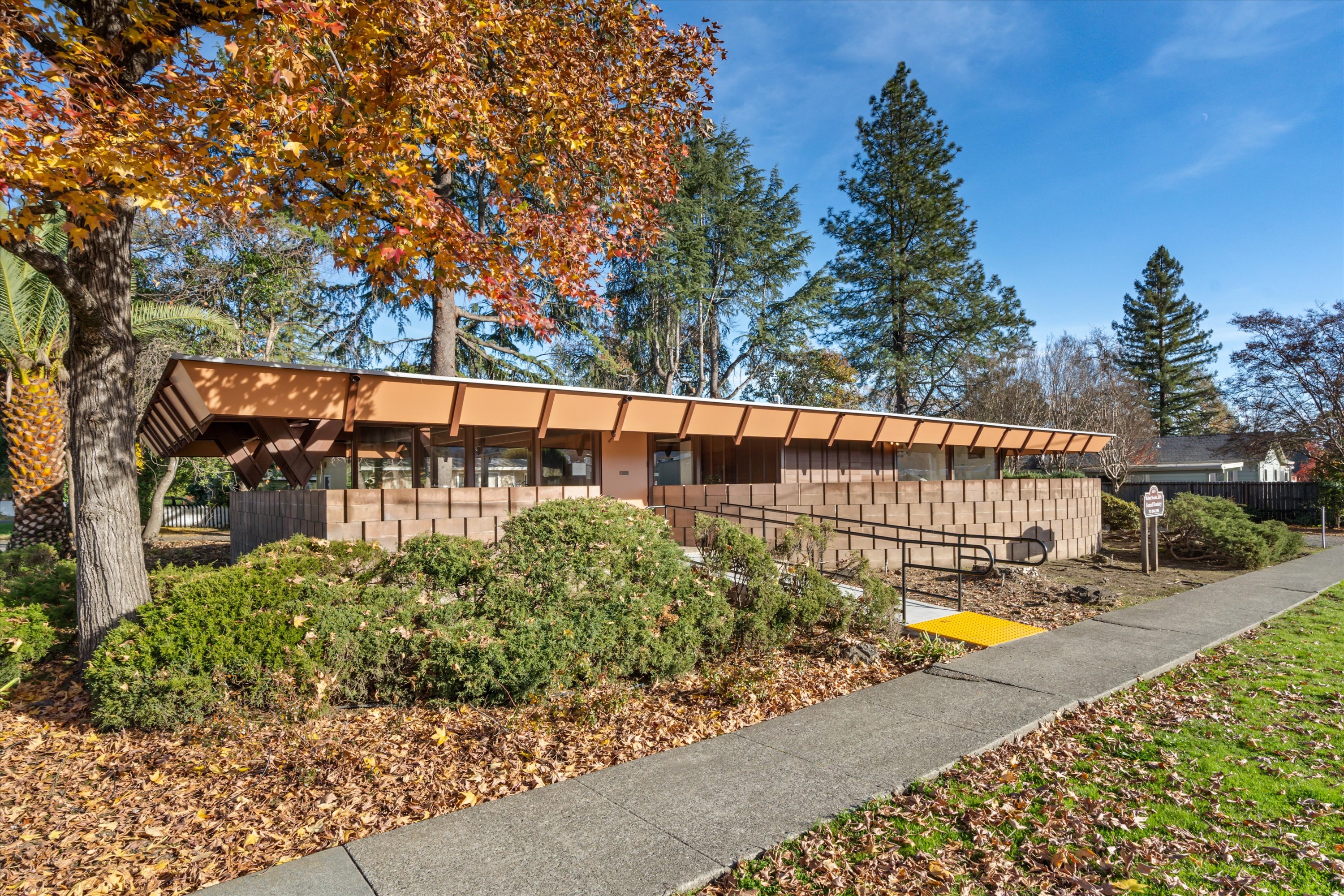 Ives Dental Office is nominated under cover of the Architecture of Aaron G. Green MPDF as an example of Aaron Green's commercial architecture; a one-story Modernist medical office located in Cloverdale, Sonoma County, completed in 1965. The concrete masonry and glass dental office has a masonry exterior wall integrated into the building and extending into the building's interior, and blends in with the surrounding foliage and landscape.