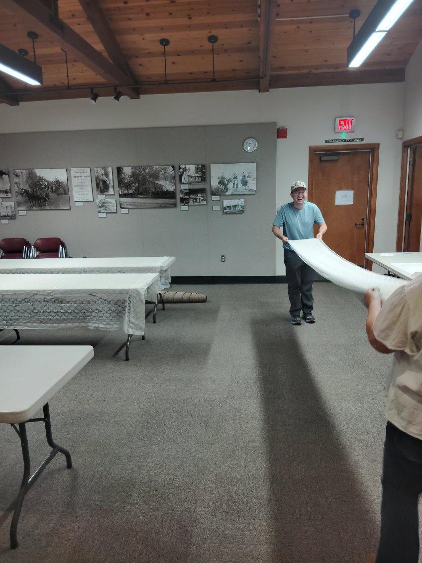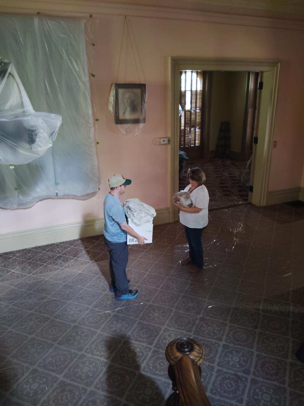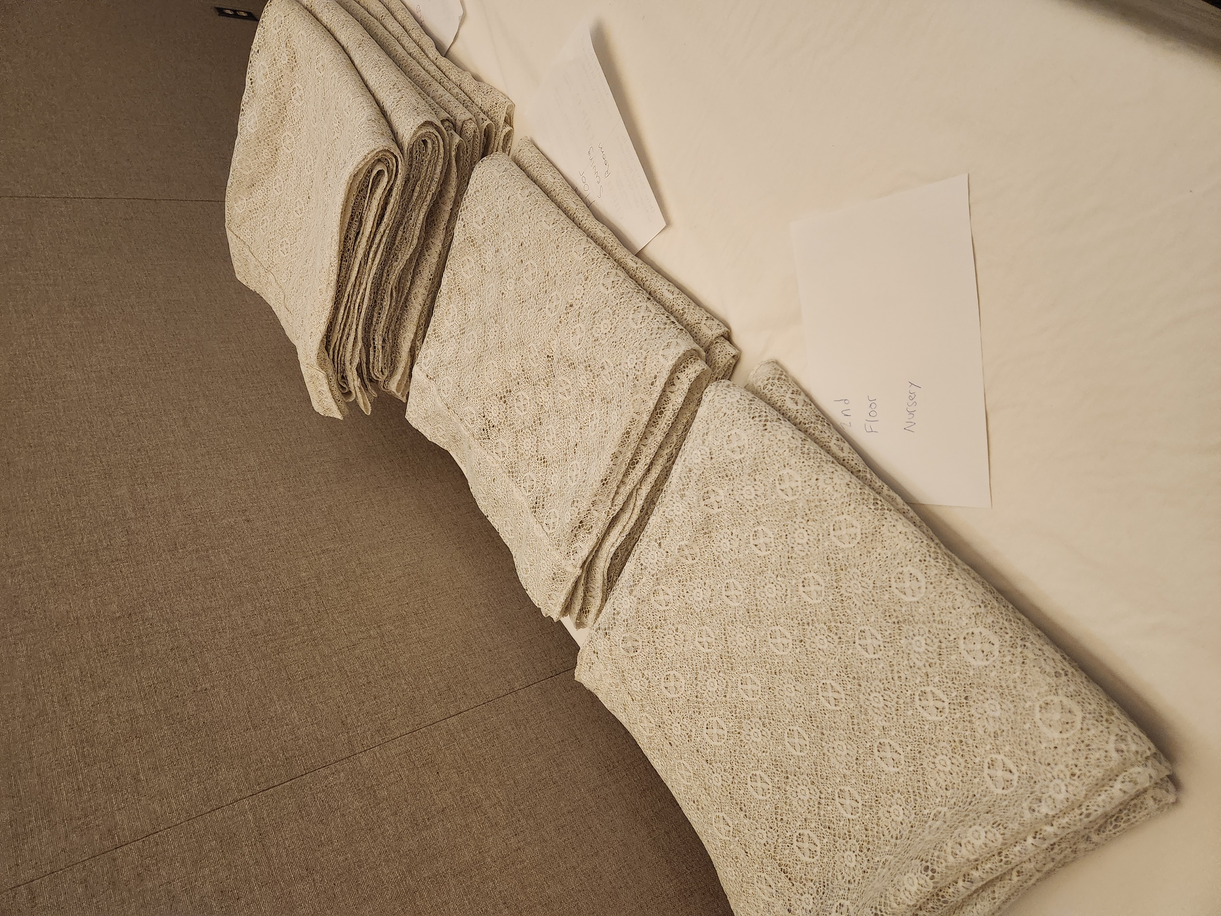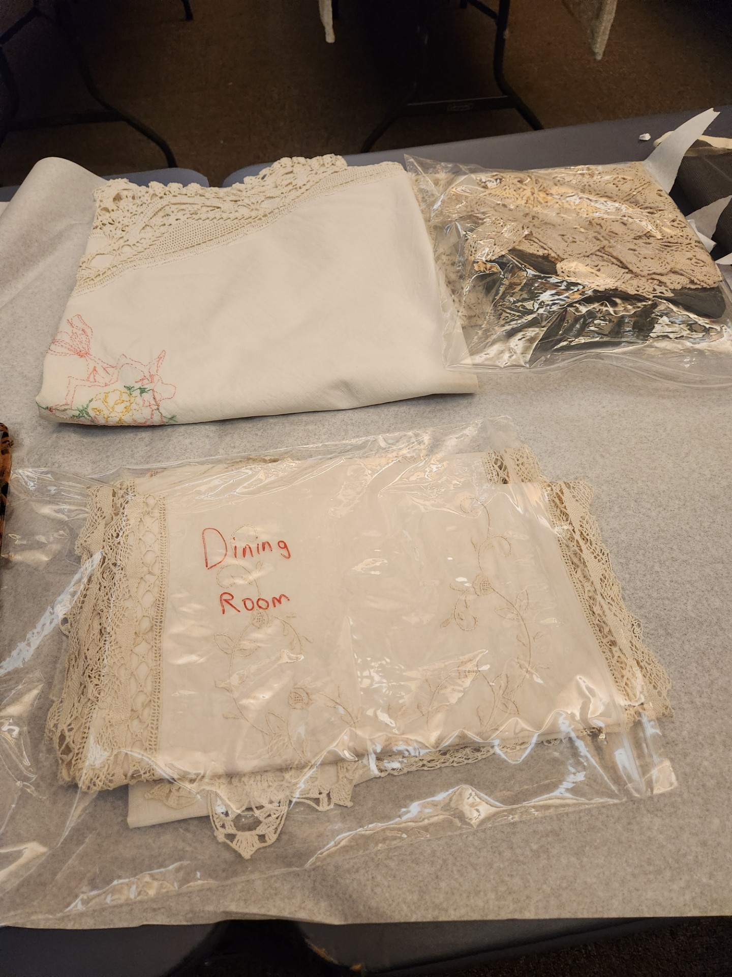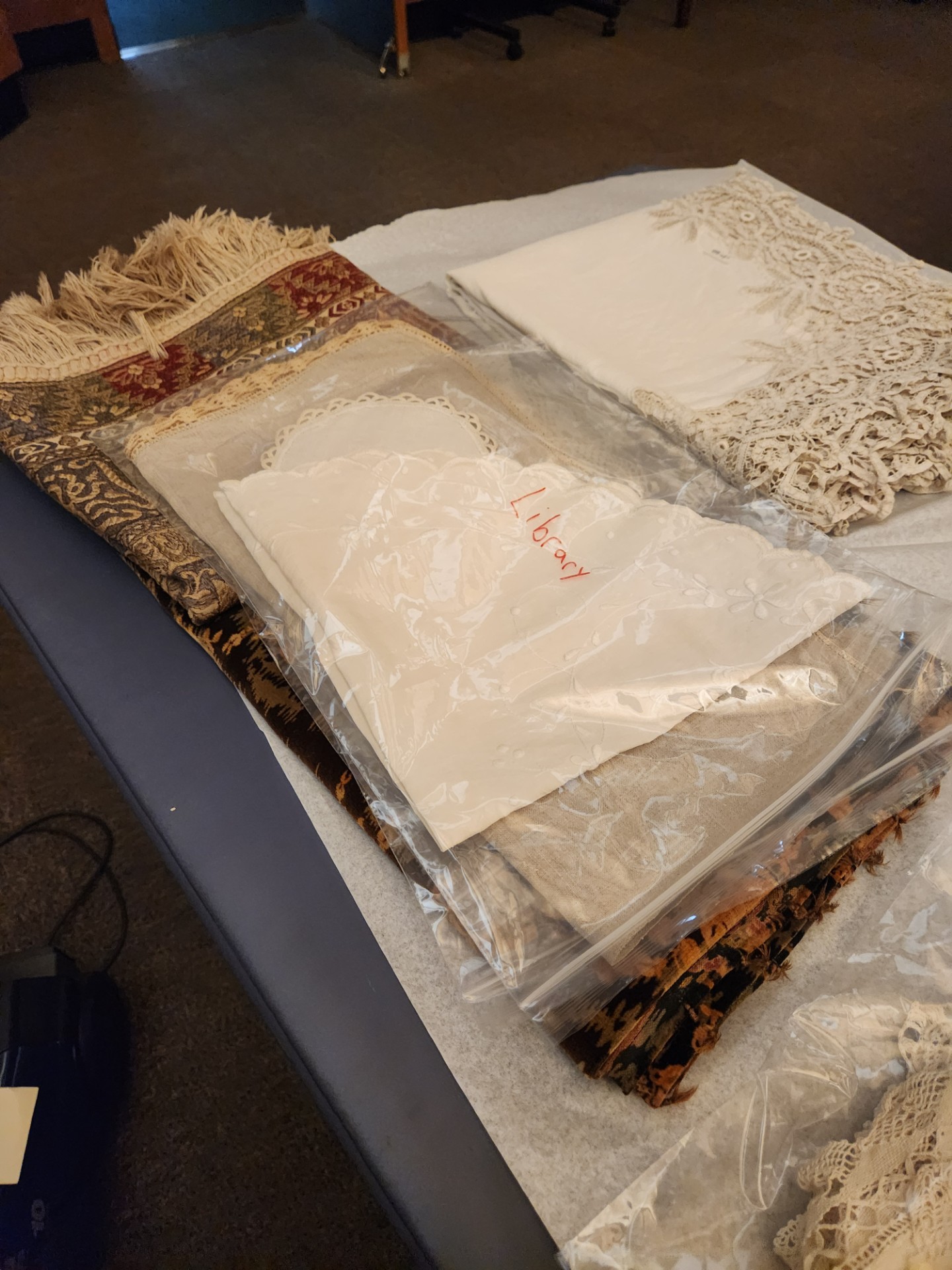 11/26/2024After carefully washing and drying all the Mansion’s 70 curtain panels, they have been neatly folded and stored in plastic to be rehung for the reopening. Equally, each doily and tablecloth has been washed and awaits to be returned to its original location in the Manion.