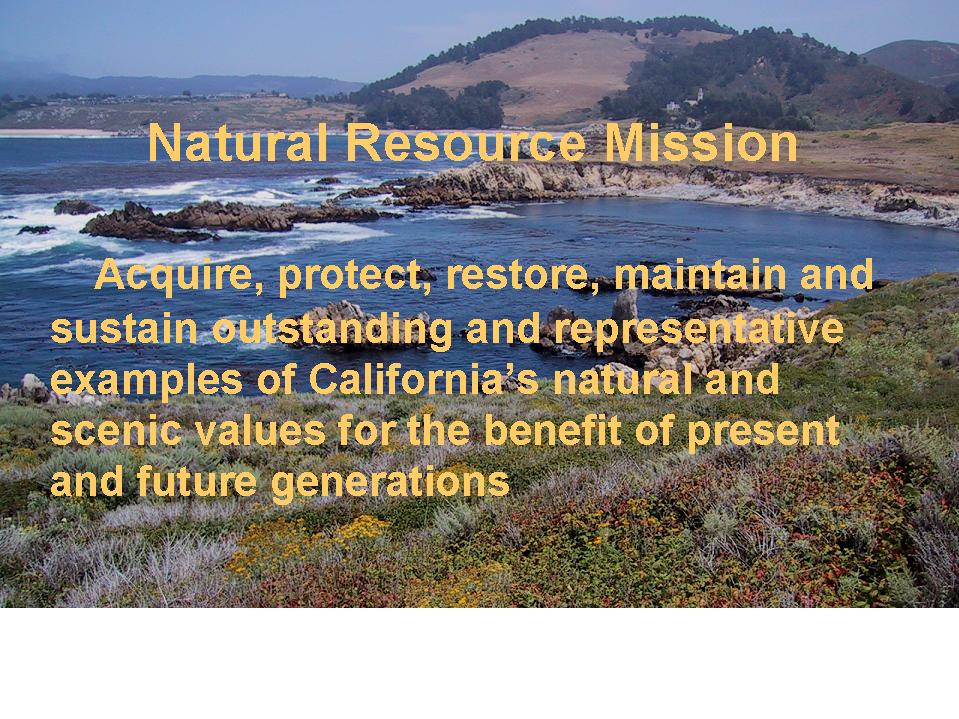 The Natural Resources Division is responsible for providing leadership and policy direction that contributes to protection and improved management of natural resources in the State Park System.